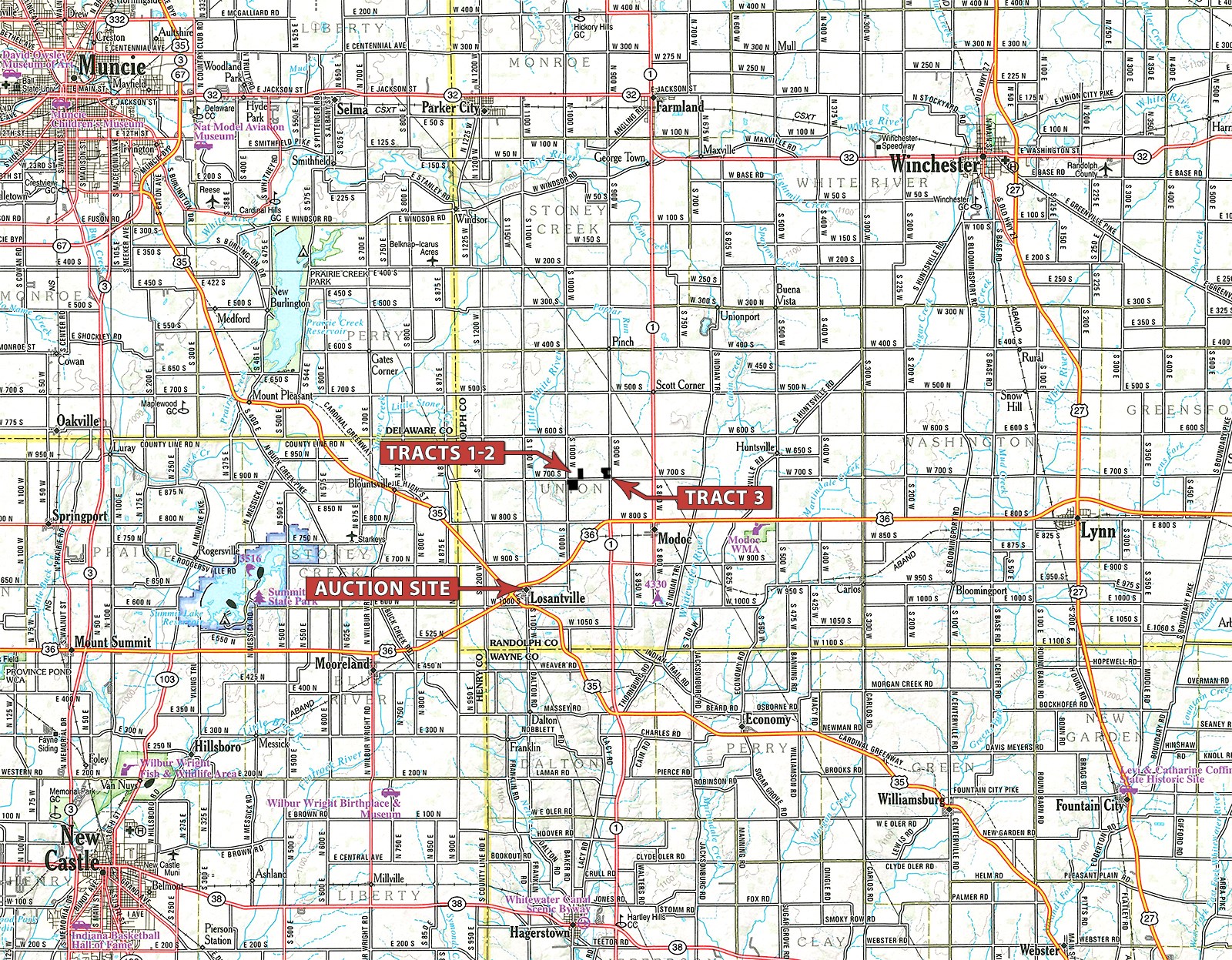 From the intersection of SR 1 and US 36 at Modoc, IN: Travel North on SR 1 for 1 mile to CR 700 South, then West 1 mile to Tract 3. Tracts 1 & 2 are approximately 1/2 mile further west along CR 700 South.
