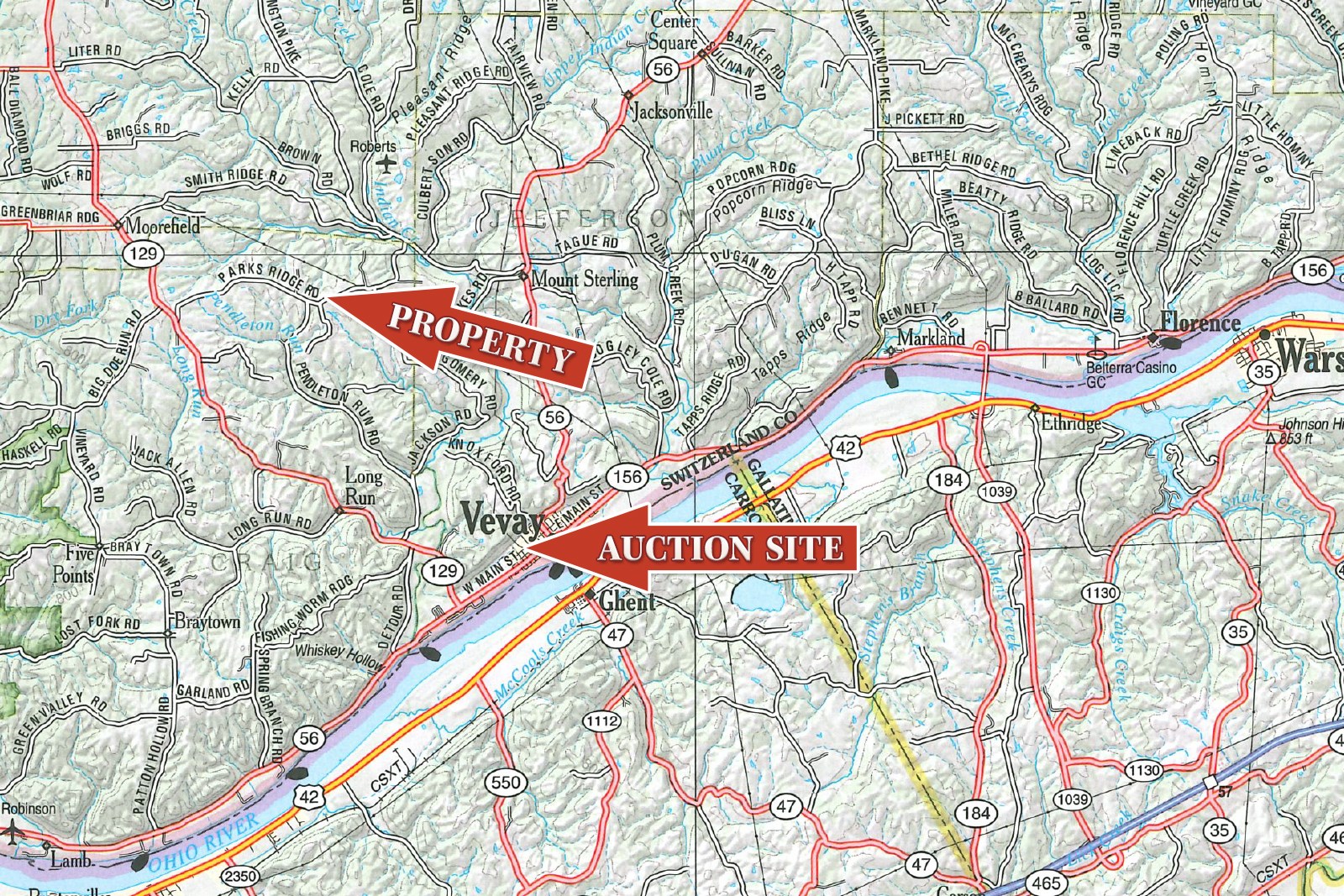 From the intersection of SR 56 & SR 129 near Vevay, IN, drive North on SR 129 for 5.6 miles to Parks Ridge Rd. Turn right & drive East along Parks Ridge Rd for 2.3 miles to property.