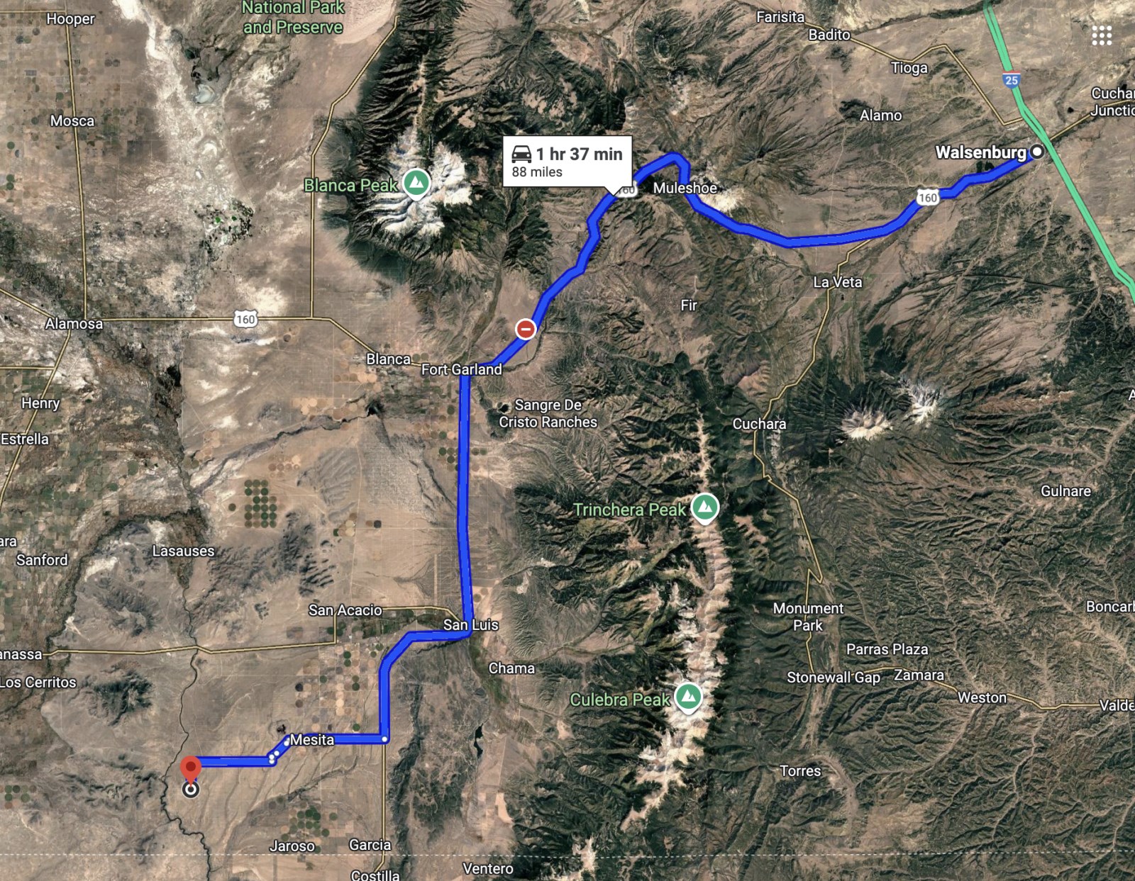 Follow US-160 W to CO-159 S/Miranda Ave in Fort Garland