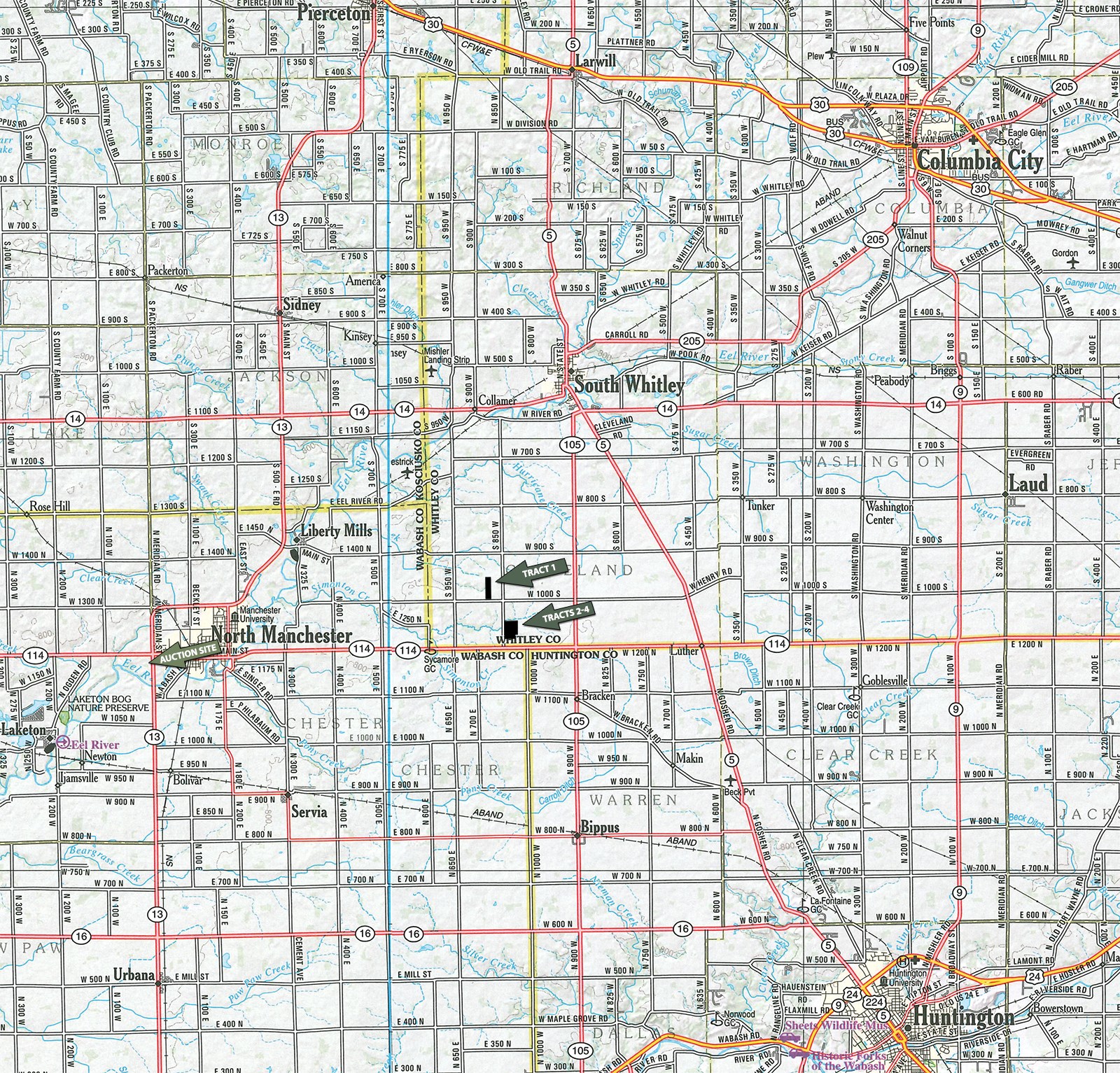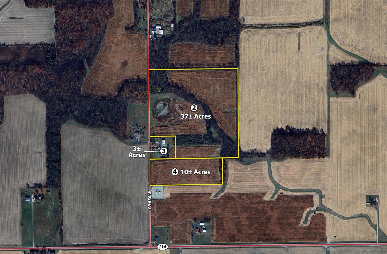 From the intersection of SR 114 & SR 105, take SR 114 West 1-1/2 miles to CR 850 W then North 1/4 mile to Tracts 2, 3 & 4. Continue North 1/2 mile to CR 1000S then travel West 1/4 mile to Tract 1.