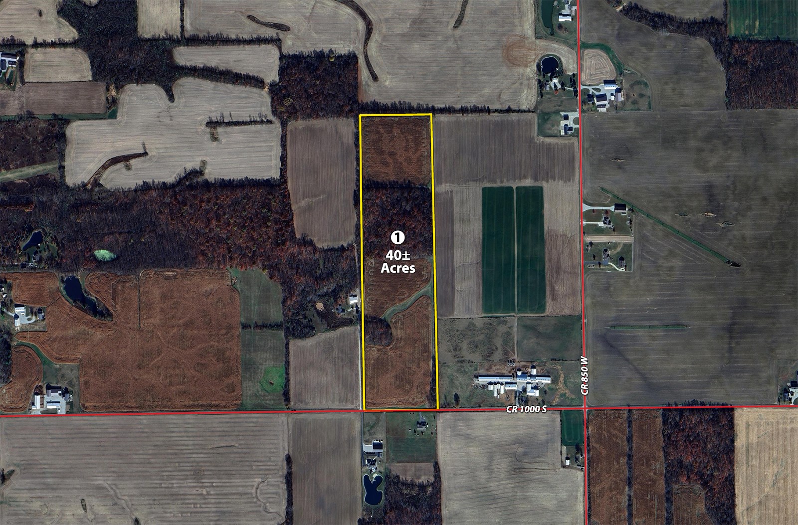 Tract 1: 40± ac with road frontage on CR 1000S. Approx. 29+/- acres of productive tillable farmland with primarily Blount & Pewamo soils. 11+/- acres of wooded recreational hunting ground complete this tract.