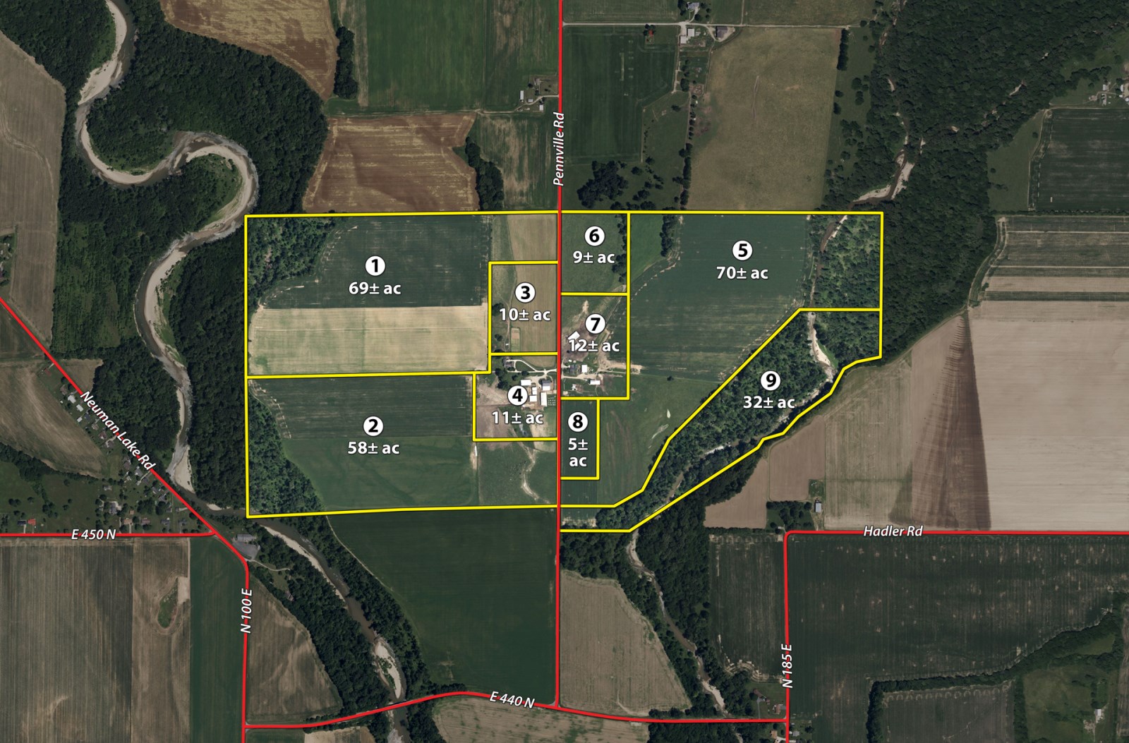 Tract 7: 12± ac farmstead (4740 Pennville Rd., Milton, IN 47357) with a 2 story Farmhouse (2,090 sf) with an attached 2 car garage. Multiple buildings including 42ft x 60ft x 14ft pole barn, a 50ft x 90ft x 12ft pole barn and a 30ft Harvestore silo. Additional improvements compliment this tract. Small farmsteads like this are hard to find.