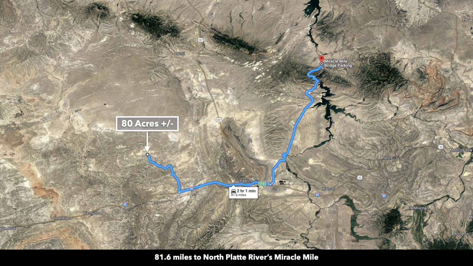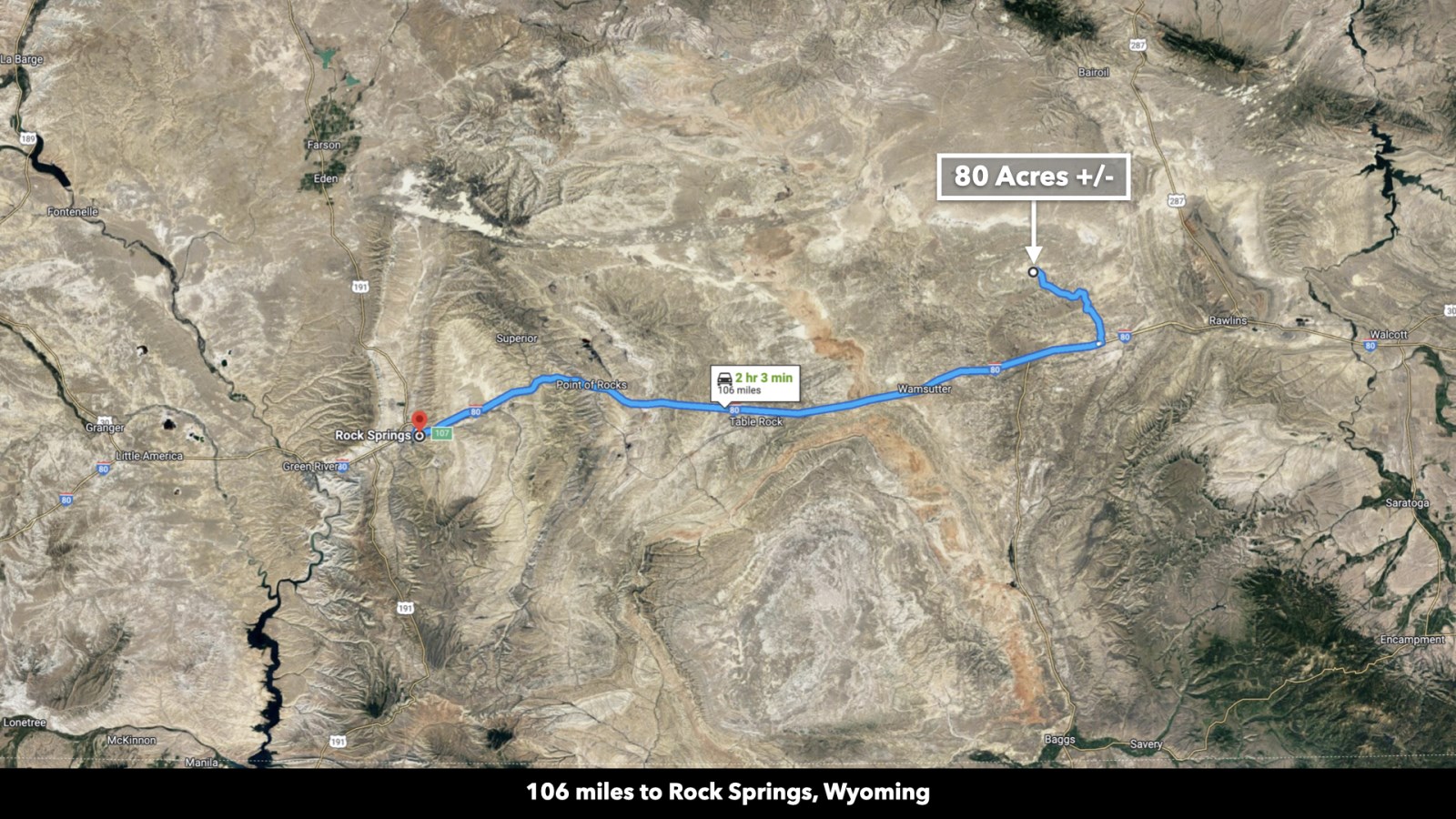 The property has 0.3 miles of road access along BLM Road 3203 which connects to I-80 15.3 miles to the south. Take the interstate west into Rock Springs or east into Rawlins. Both cities have restaurants, grocers, and professional and medical services available.